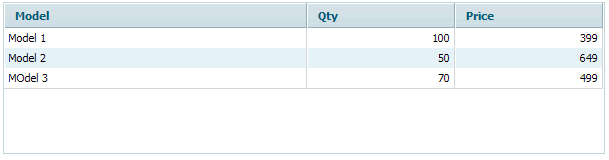 <?xml version="1.0" encoding="UTF-8"?> <rows> <row id="a"> <cell>Model 1</cell> <cell>100</cell> <cell>399</cell> </row> <row id="b"> <cell>Model 2</cell> <cell>50</cell> <cell>649</cell> </row> <row id="c"> <cell>MOdel 3</cell> <cell>70</cell> <cell>499</cell> </row> </rows>