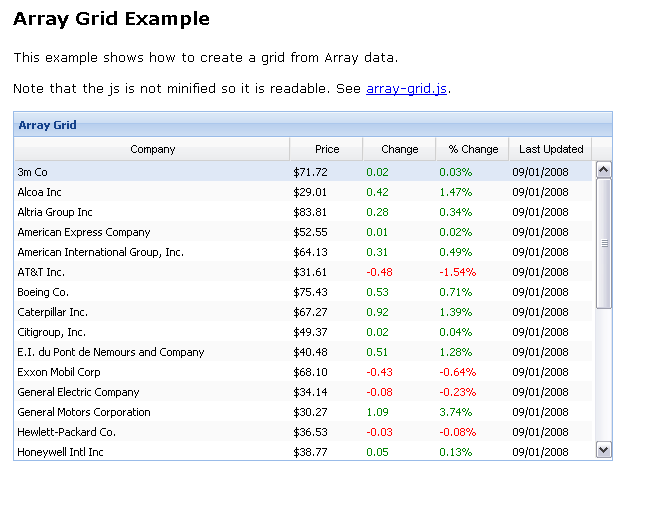 var grid = new Ext.grid.GridPanel({ store: store, columns: [ {id:'company',header: "Company", width: 160, sortable: true, dataIndex: 'company'}, {header: "Price", width: 75, sortable: true, renderer: 'usMoney', dataIndex: 'price'}, {header: "Change", width: 75, sortable: true, renderer: change, dataIndex: 'change'}, {header: "% Change", width: 75, sortable: true, renderer: pctChange, dataIndex: 'pctChange'}, {header: "Last Updated", width: 85, sortable: true, renderer: Ext.util.Format.dateRenderer('m/d/Y'), dataIndex: 'lastChange'} ], stripeRows: true, autoExpandColumn: 'company', height:350, width:600, title:'Array Grid' });